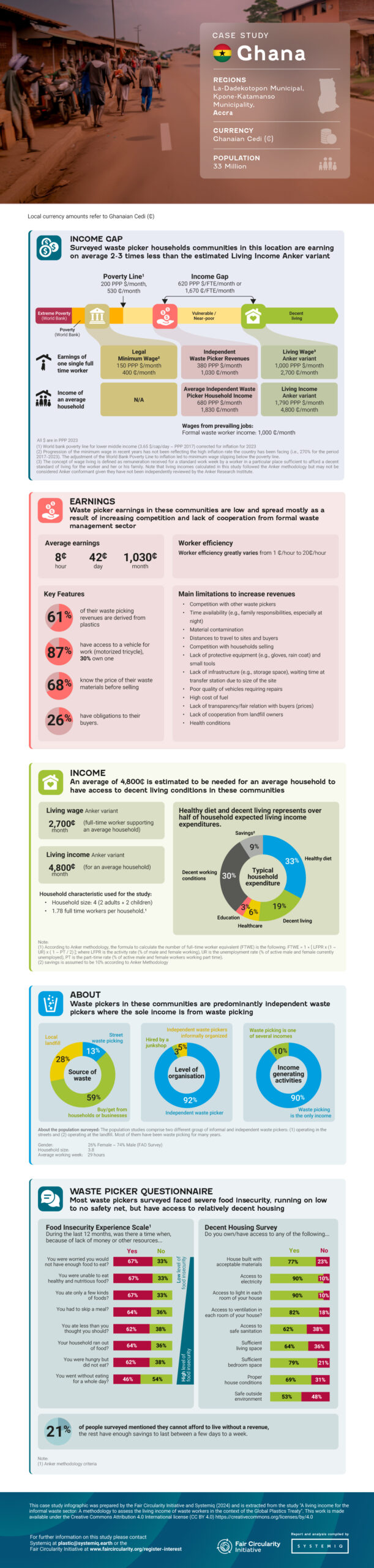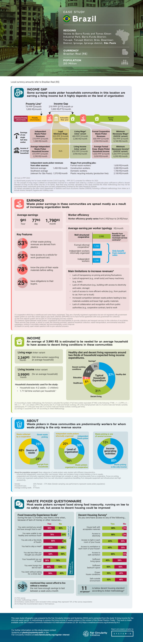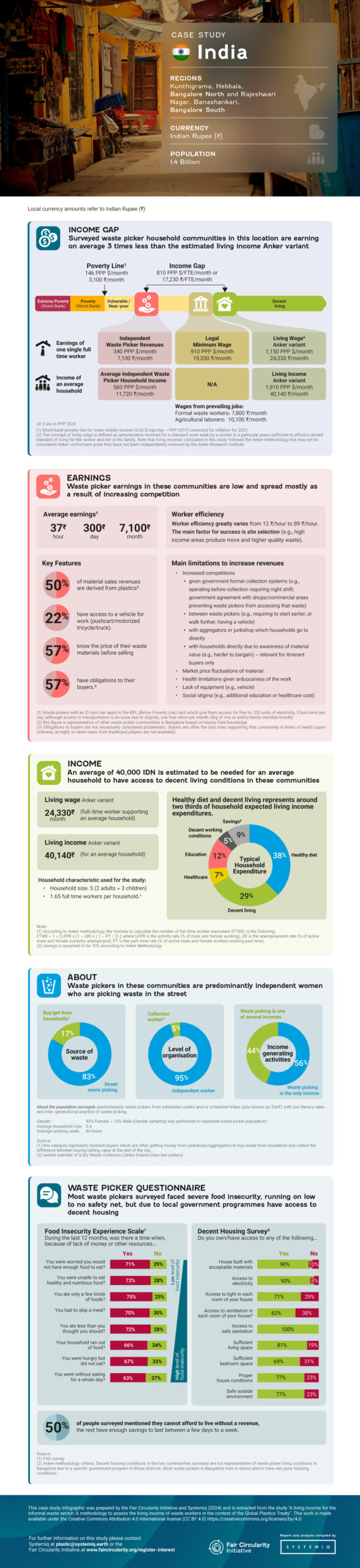 Methodology to assess the living income of waste workers, and report revealing the gap between incomes of informal waste pickers in Brazil, Ghana and India.